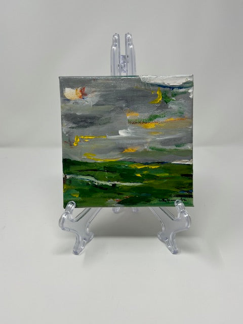 Playtime is a vibrant original painting that captures the joy and whimsy of childhood imagination. This contemporary abstract piece features a dreamy landscape of pink meadows dotted with delicate white flowers, a charming house, and playful elements that invite the viewer into a world of wonder.