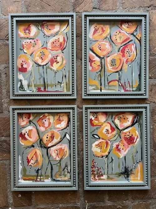 Bloom Bright is an abstract acrylic painting on a wood panel, celebrating playful movement and organic form. Loose, expressive florals emerge through layered brushstrokes and a warm, uplifting palette, giving the piece a sense of joy and spontaneity. The funky frame with its beaded border adds texture and character, perfectly complementing the painting’s lively spirit. This piece is designed to bring color, energy, and a touch of whimsy to any space.